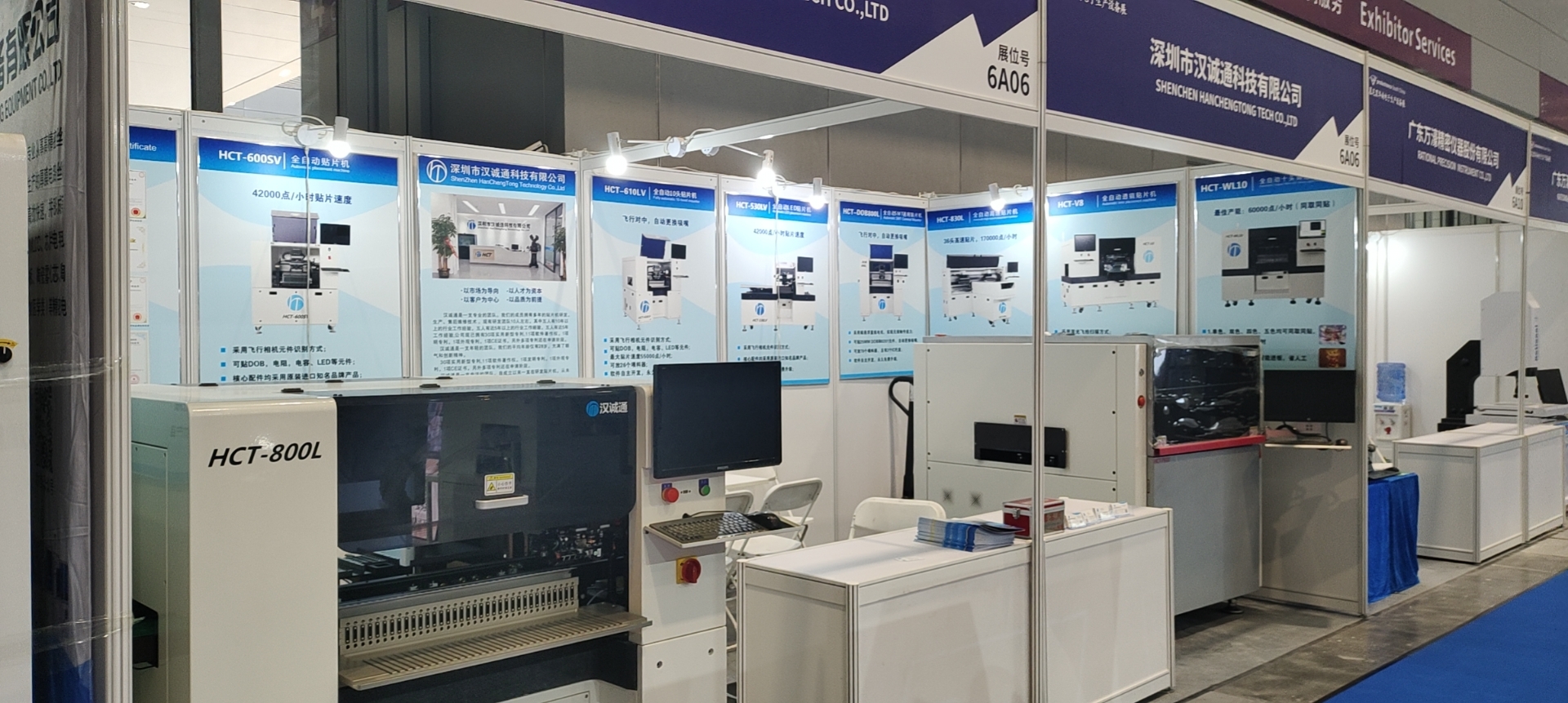 受大環(huán)境的影響,慕尼黑上海展今年取消了,一年一度的華南慕尼黑電子設(shè)備展已開幕,漢誠通科技展出DOB貼片機和全自動錫膏印刷機。
